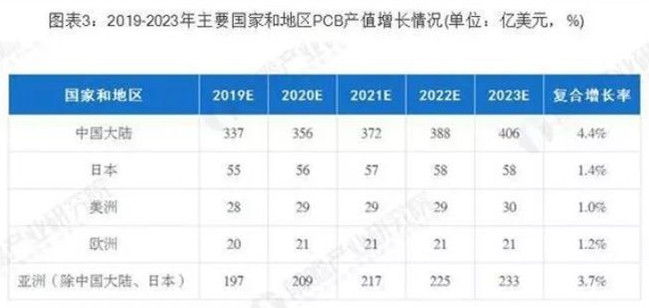 據(jù)Prismark預(yù)測(cè),未來(lái)5年亞洲將繼續(xù)主導(dǎo)全球PCB市場(chǎng)的發(fā)展,而中國(guó)的核心地位更加穩(wěn)固,中國(guó)大陸地區(qū)PCB行業(yè)將保持4.4%的復(fù)合增長(zhǎng)率,至2023年行業(yè)總產(chǎn)值將達(dá)到405.56億美元。在PCB公司"大型化、集中化"趨勢(shì)下,已較早確立領(lǐng)先優(yōu)勢(shì)的大型PCB公司將在未來(lái)全球市場(chǎng)競(jìng)爭(zhēng)中取得較大優(yōu)勢(shì)。