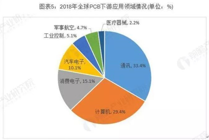 電子信息產(chǎn)業(yè)的蓬勃發(fā)展是PCB行業(yè)發(fā)展的重要助力。從下游應(yīng)用領(lǐng)域分布來(lái)看,2018年通訊行業(yè)的PCB市場(chǎng)規(guī)模最大,占比約為33.4%;其次是計(jì)算機(jī)行業(yè),占比約為29.4%。其他領(lǐng)域PCB市場(chǎng)規(guī)模較大的是消費(fèi)電子、汽車電子。